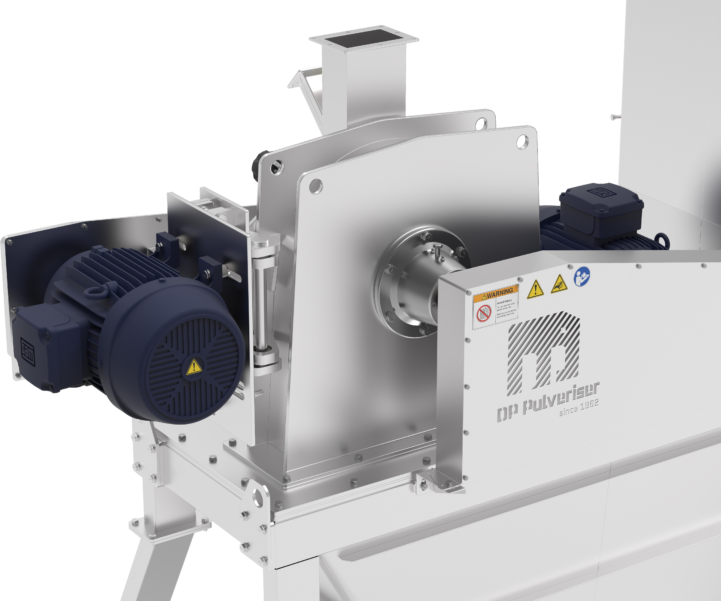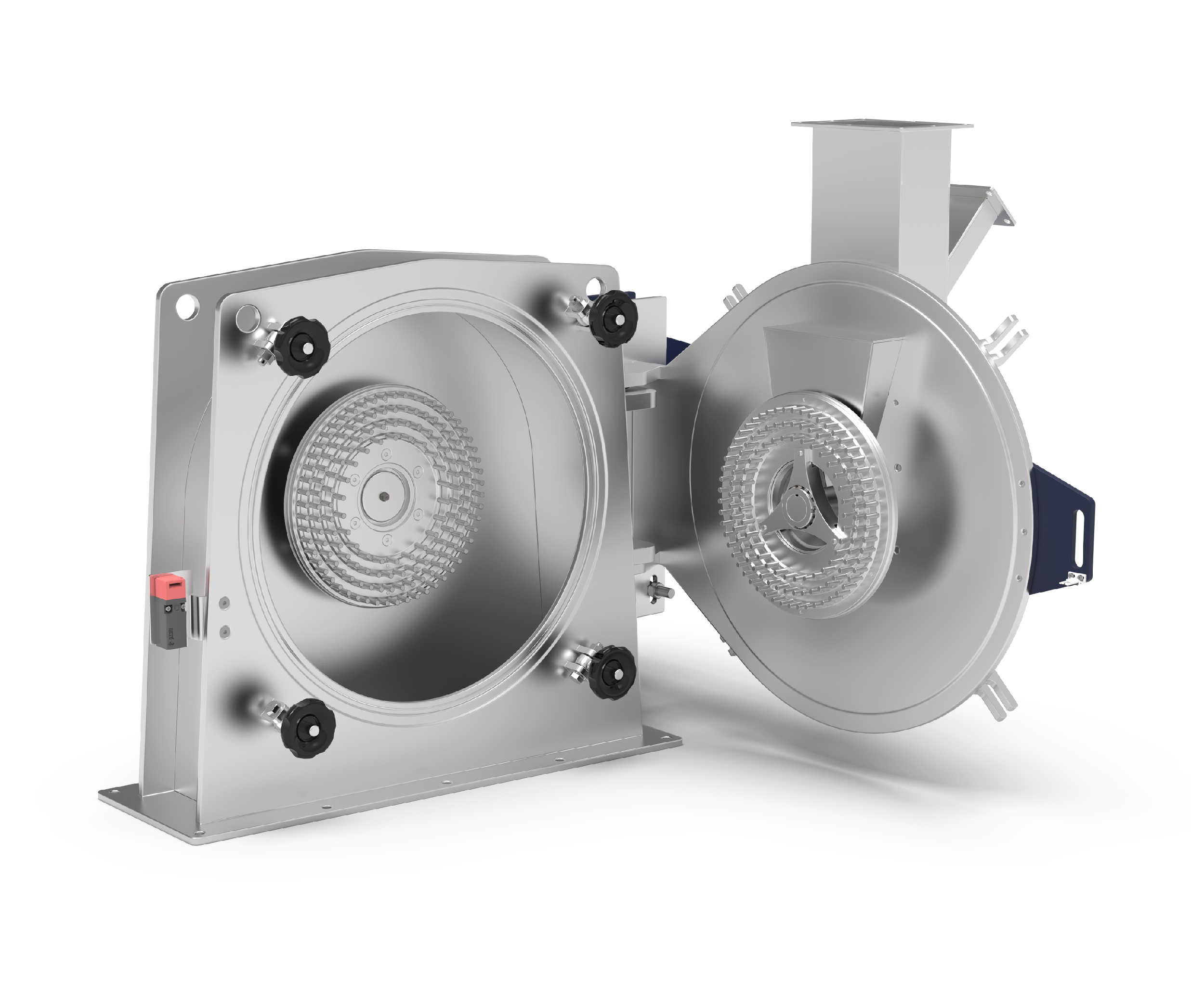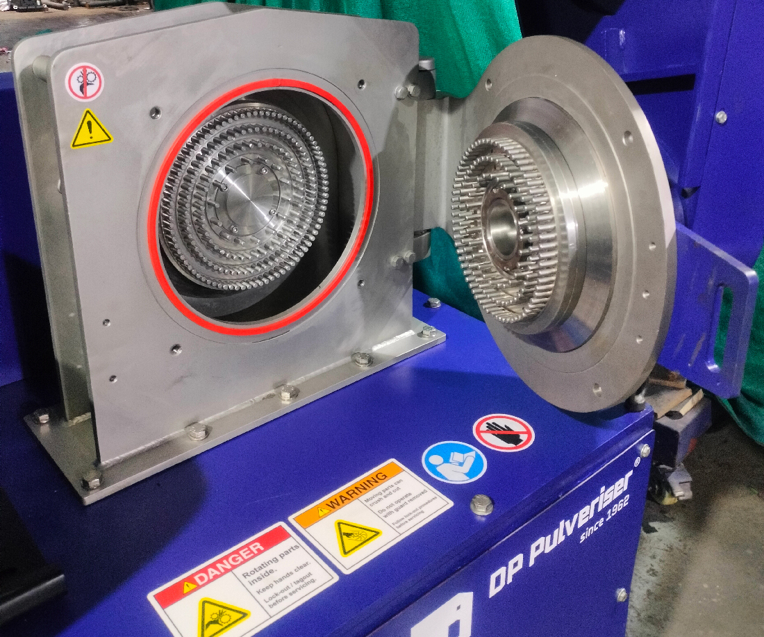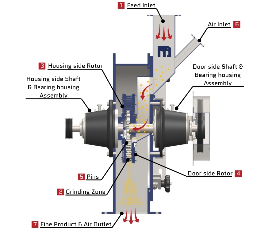 At the heart of the mill are two precision engineered rotors the housing side rotor(3) and the door side rotor(4) each equipped with intermeshing pins(5). These rotors spin in opposite direction, generating a maximum relative tip speed of up to 250 m/s. This high speed counter rotation create intense impact and shear forces, resulting in rapid deagglomeration and efficient particle size reduction.