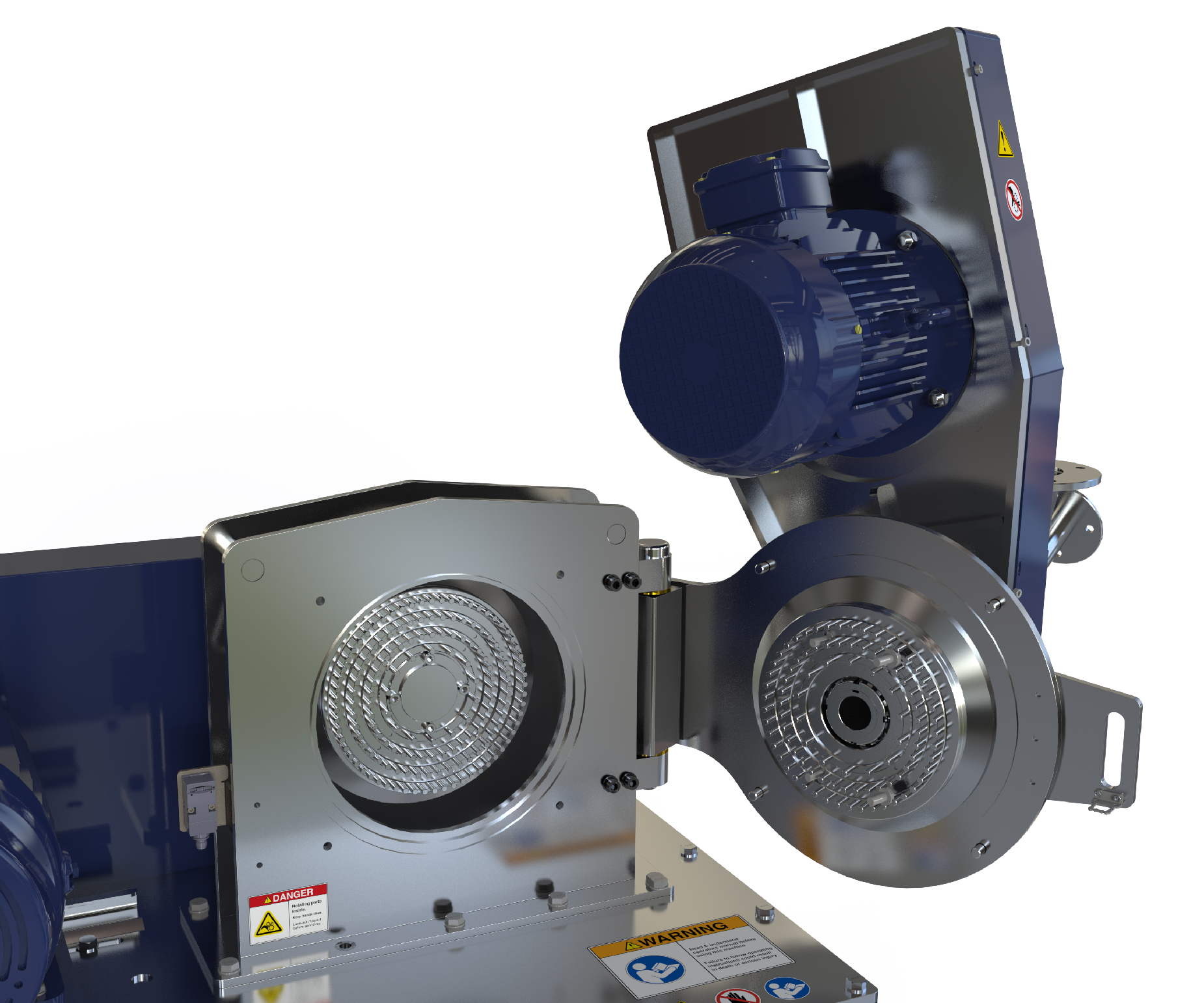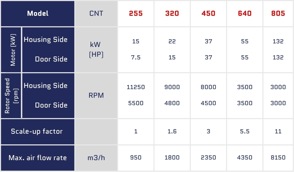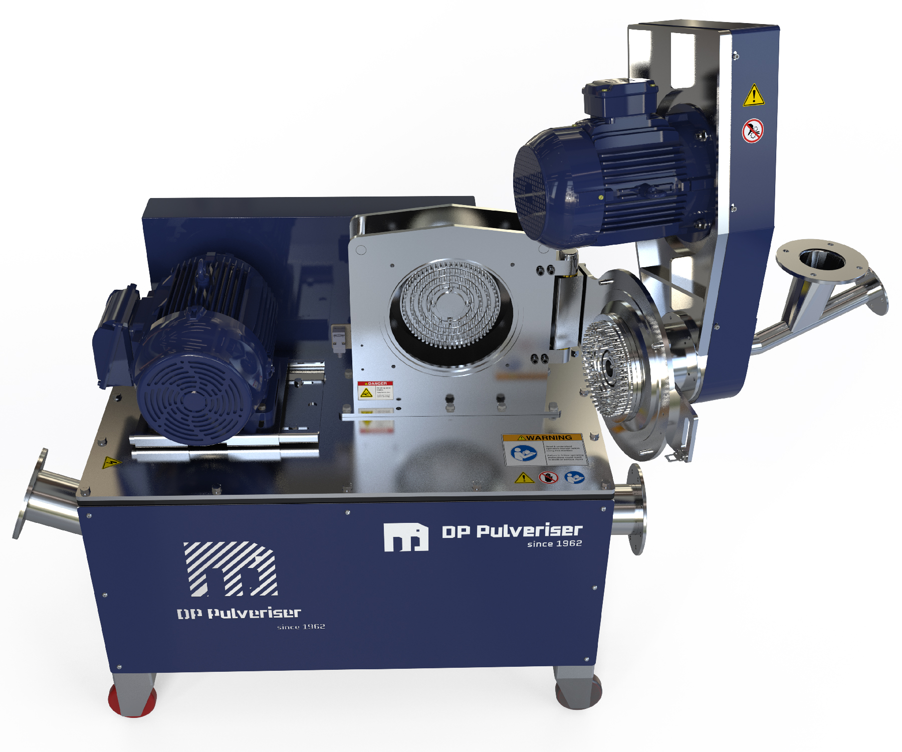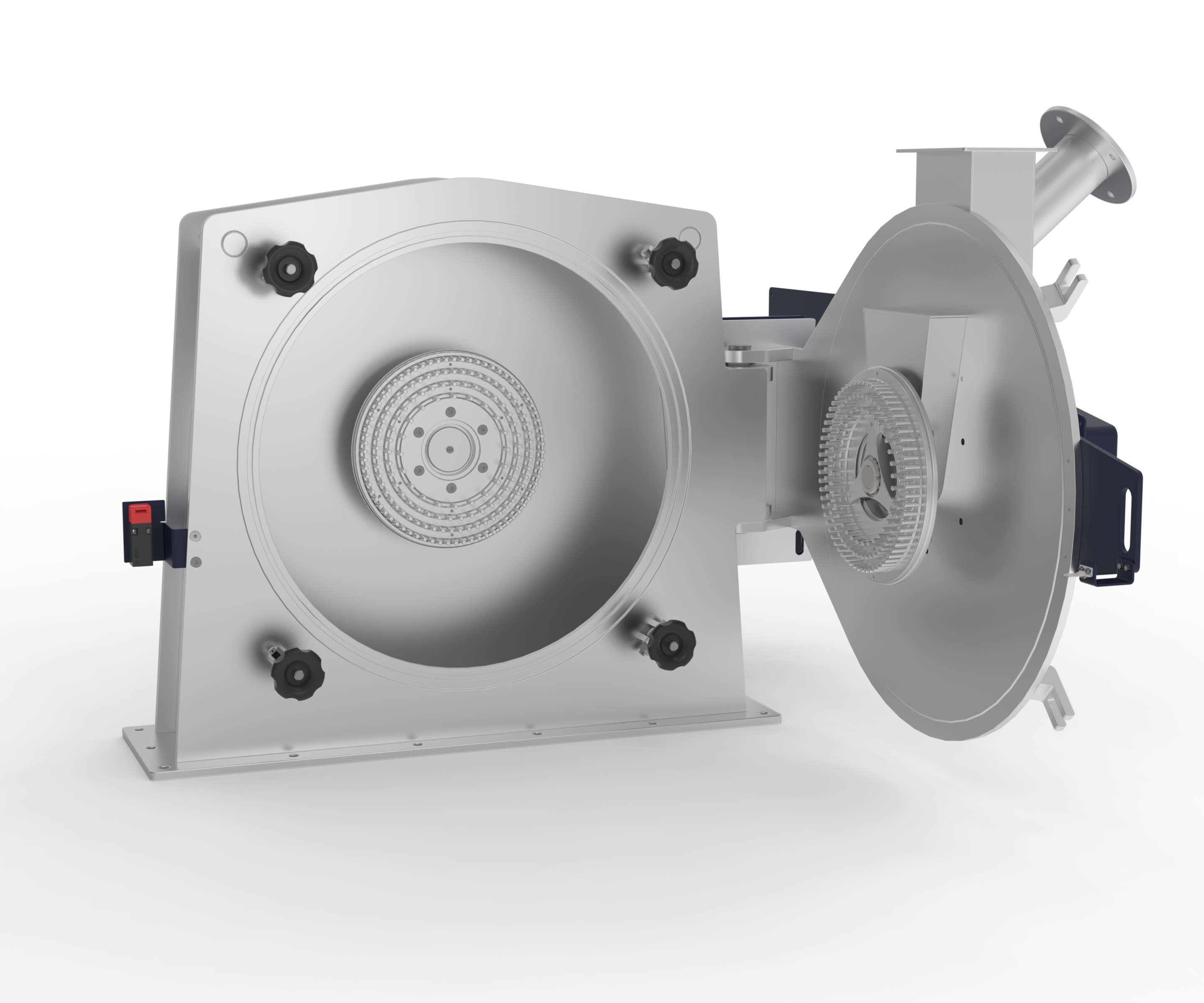 At the heart of the mill are two precision engineered rotors the housing side rotor(3) and the door side rotor(4) each equipped with intermeshing pins(5). These rotors spin in opposite direction, generating a maximum relative tip speed of up to 250 m/s. This high speed counter rotation create intense impact and shear forces, resulting in rapid deagglomeration and efficient particle size reduction.