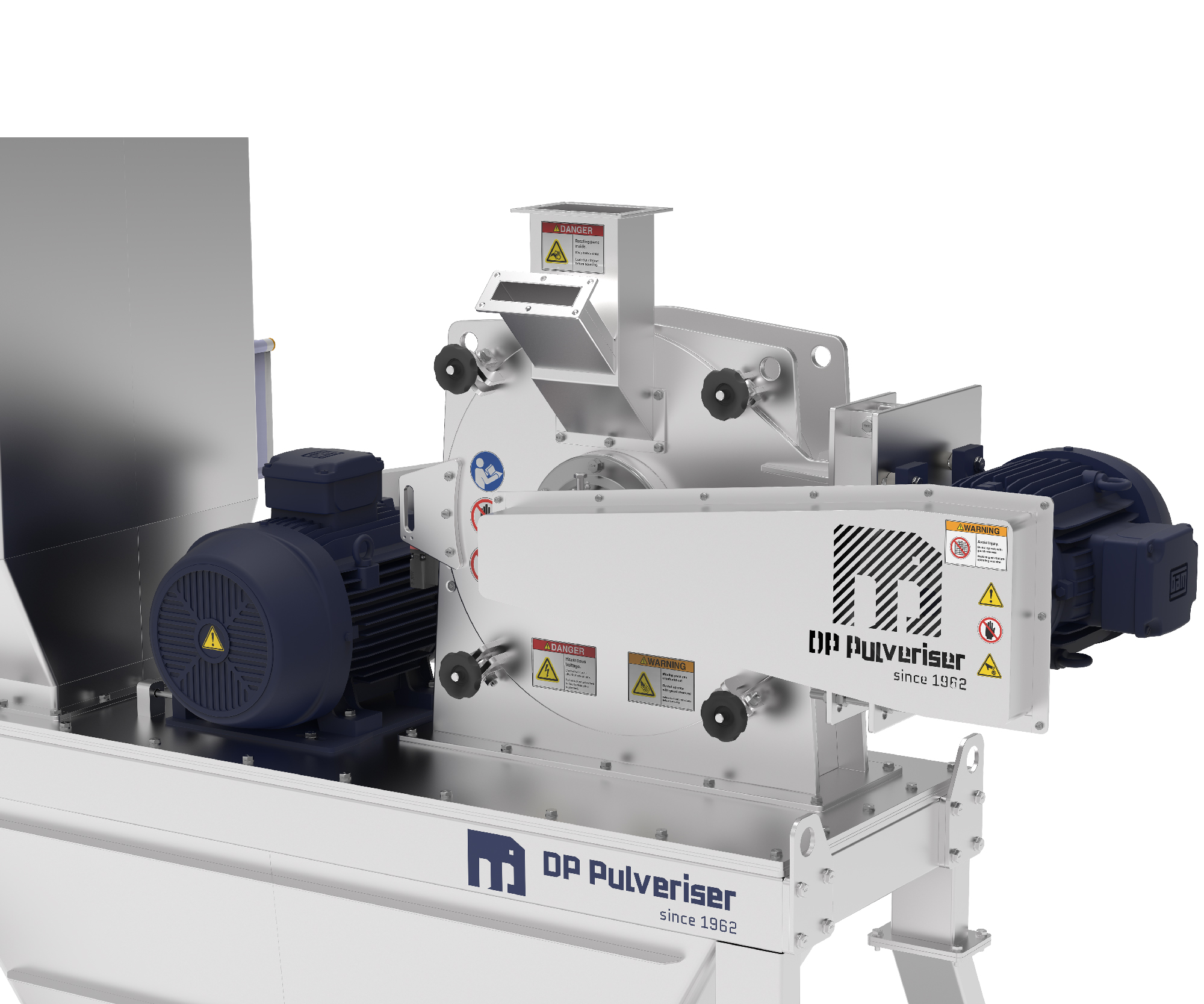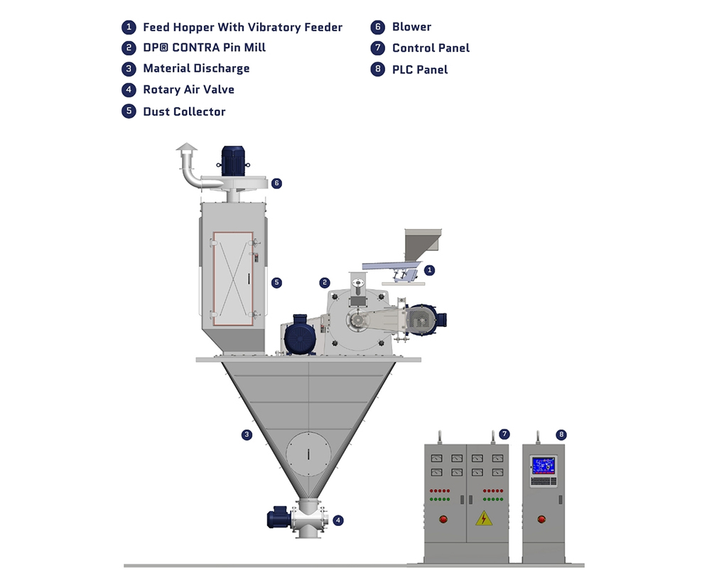 The DP® CONTRA Pin Mill is designed for efficient ultra-fine grinding using two contra-rotating pin discs. Material enters through the feed inlet(1) and is directed into the grinding zone(2) with the aid of controlled feeding systems such as a screw or vibratory feeder. Simultaneously, air is introduced through the air inlet(6) to assist in transporting and fluidizing the material.