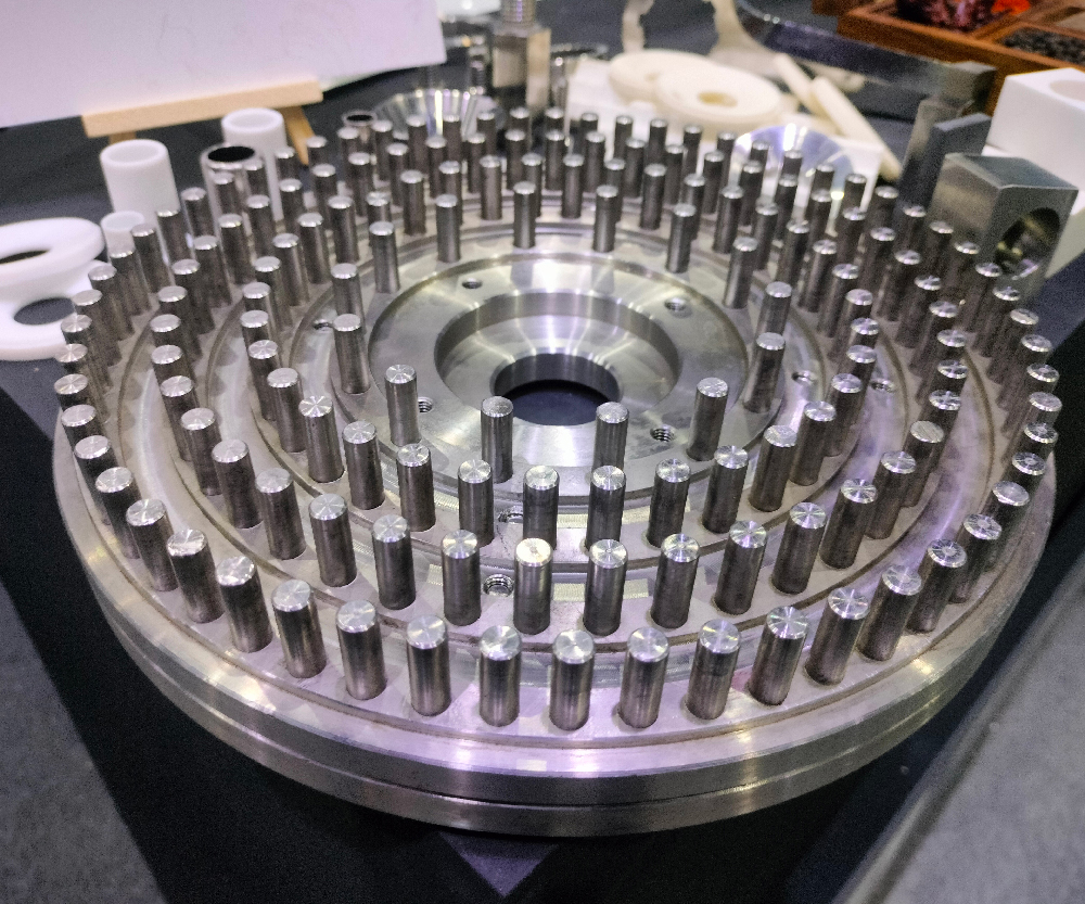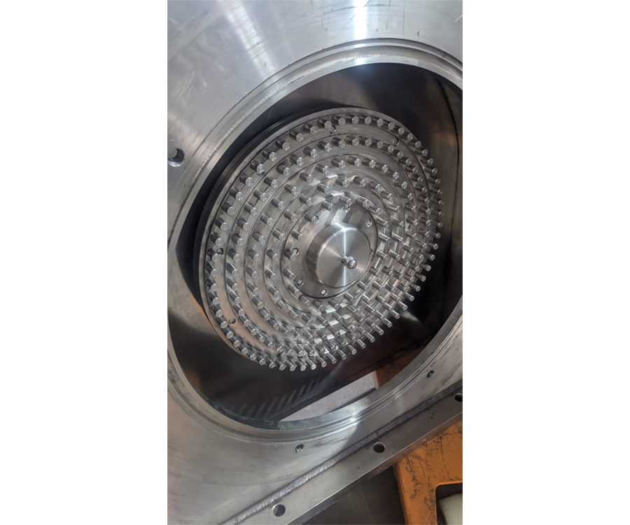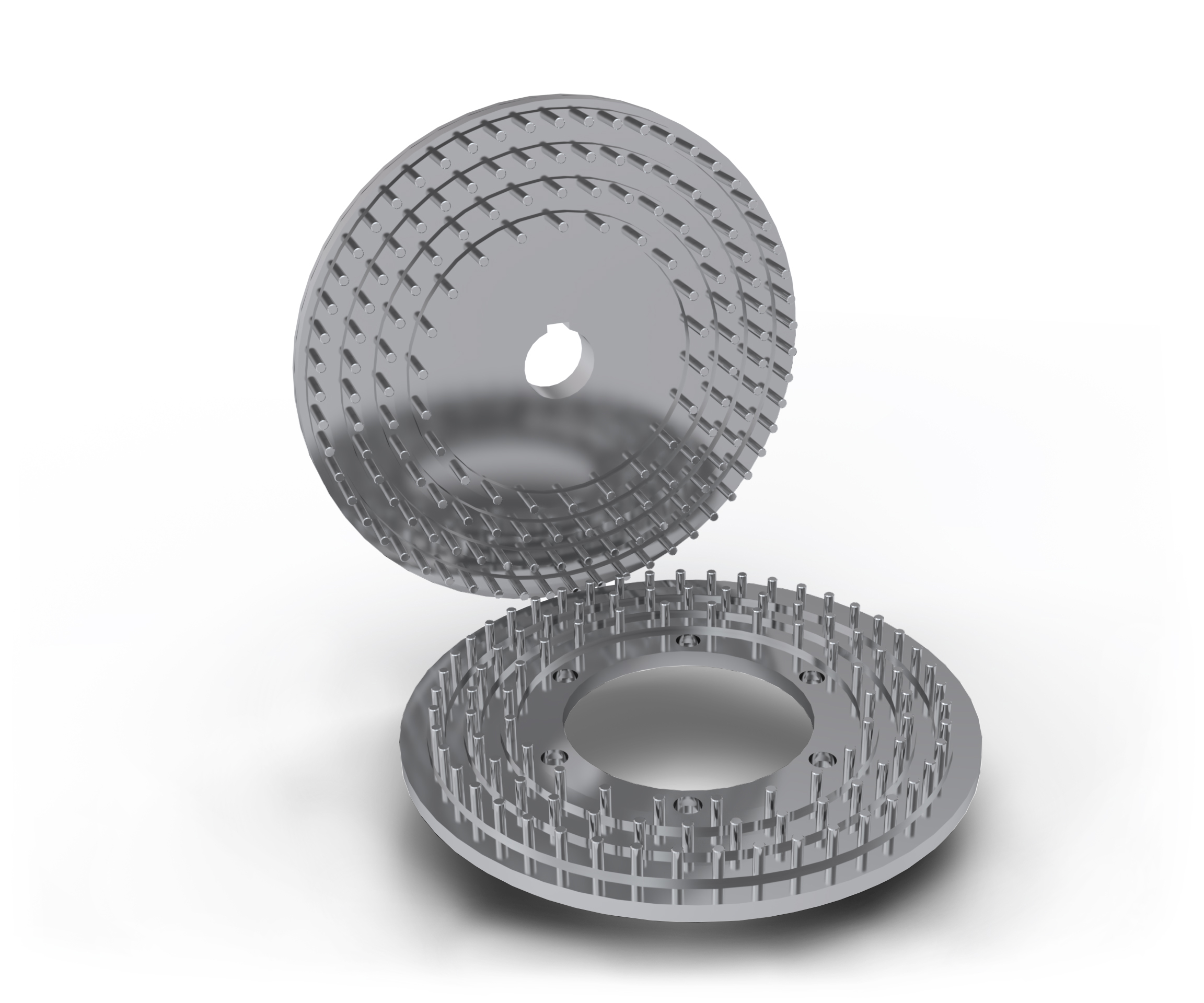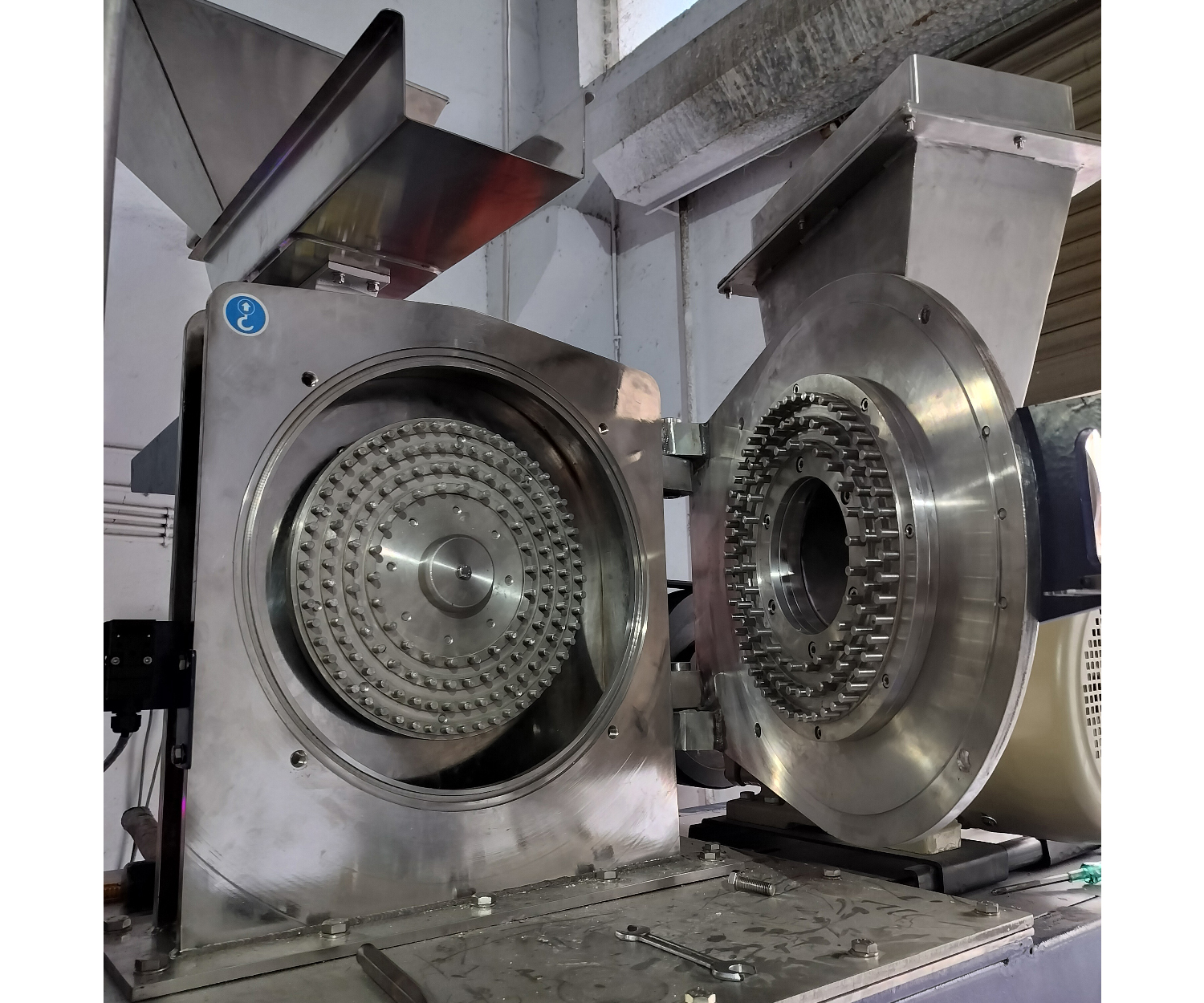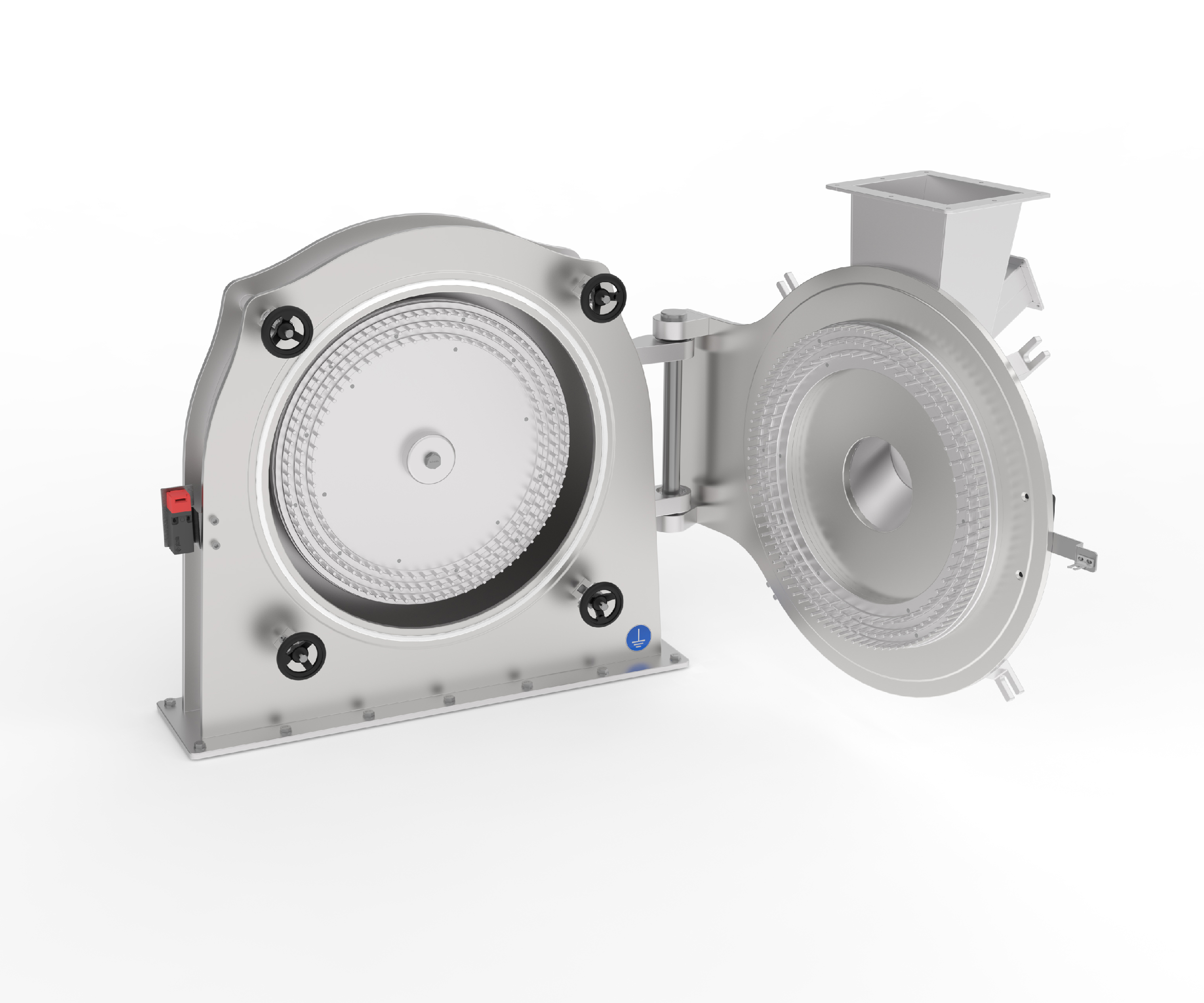 Inside the grinding chamber, the housing side rotor (3) and the door side stator (4) are equipped with precisely arranged pins (5). As the rotor spins at high speed, particles are accelerated and collide repeatedly with the stationary pins, as well as with each other. These high-energy collisions result in rapid size reduction without the use of screens.