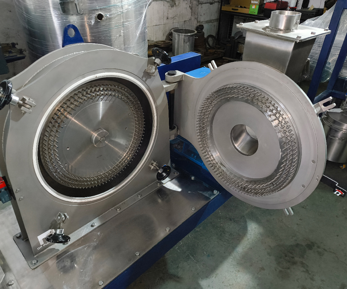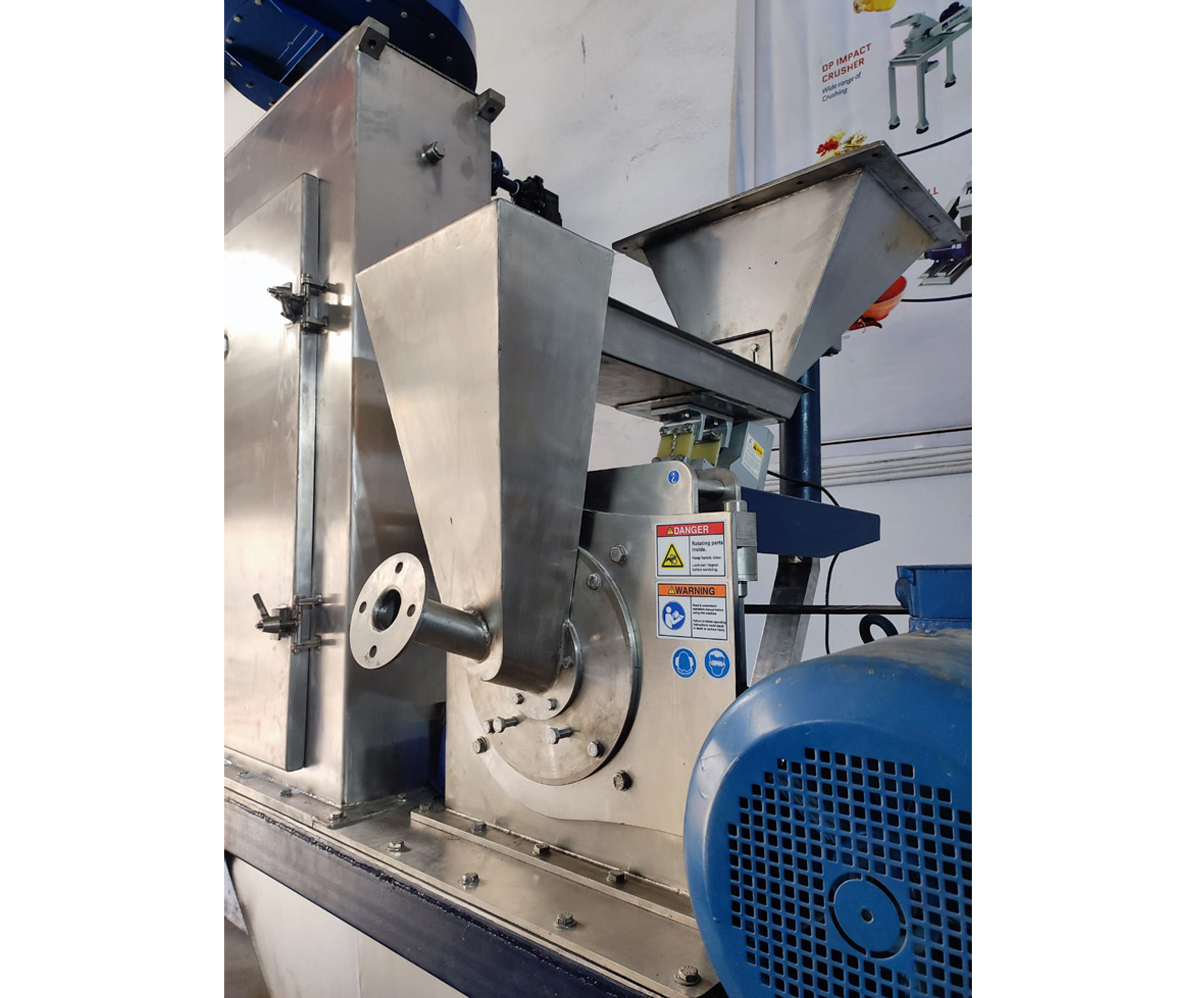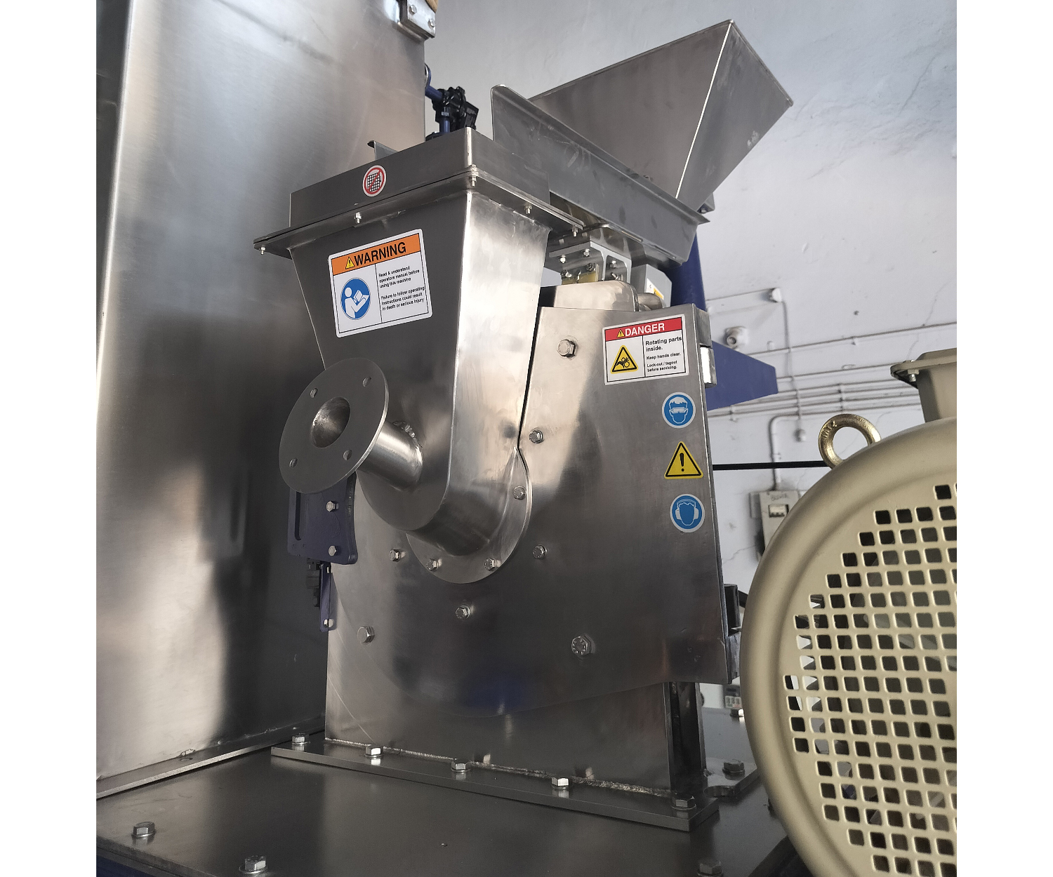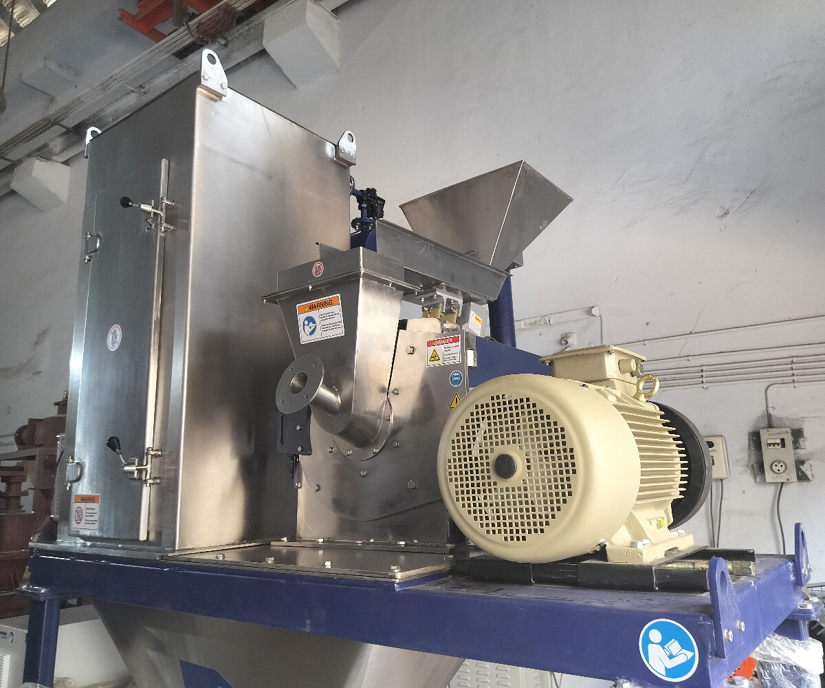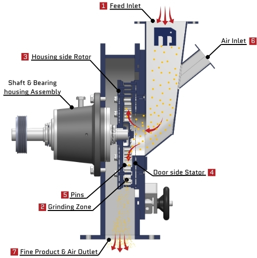 This configuration is ideal for crystalline, brittle, and low-oil content materials, producing consistent, uniform fineness. The final product, along with process air, exits via the fine product & air outlet (7) for collection or pneumatic conveying. Particle size can be adjusted by varying rotor speed, pin configuration, and feed rate to meet specific application requirements.