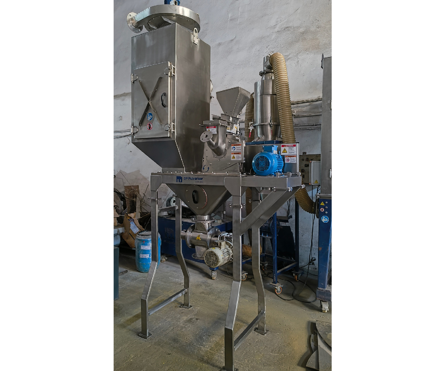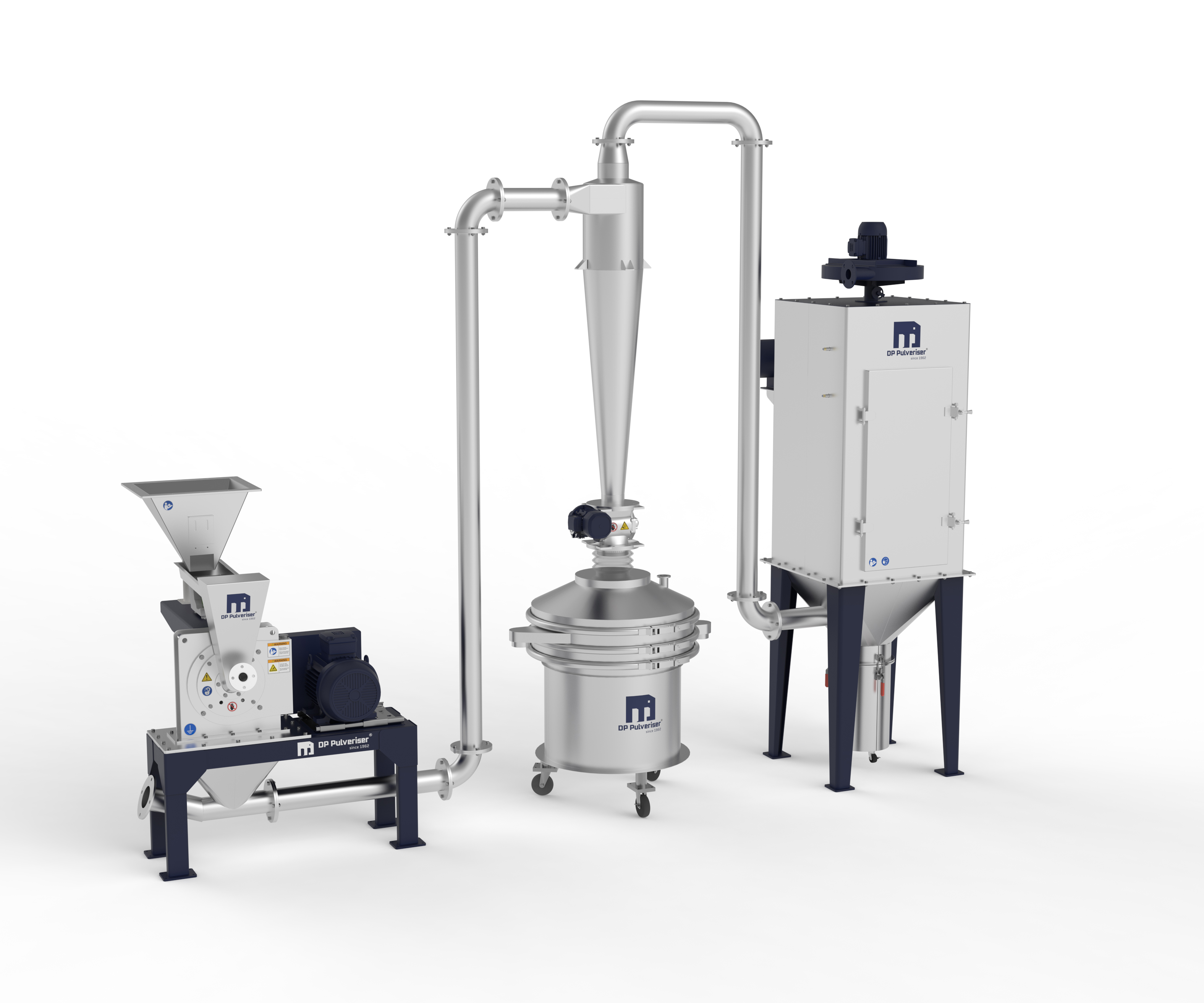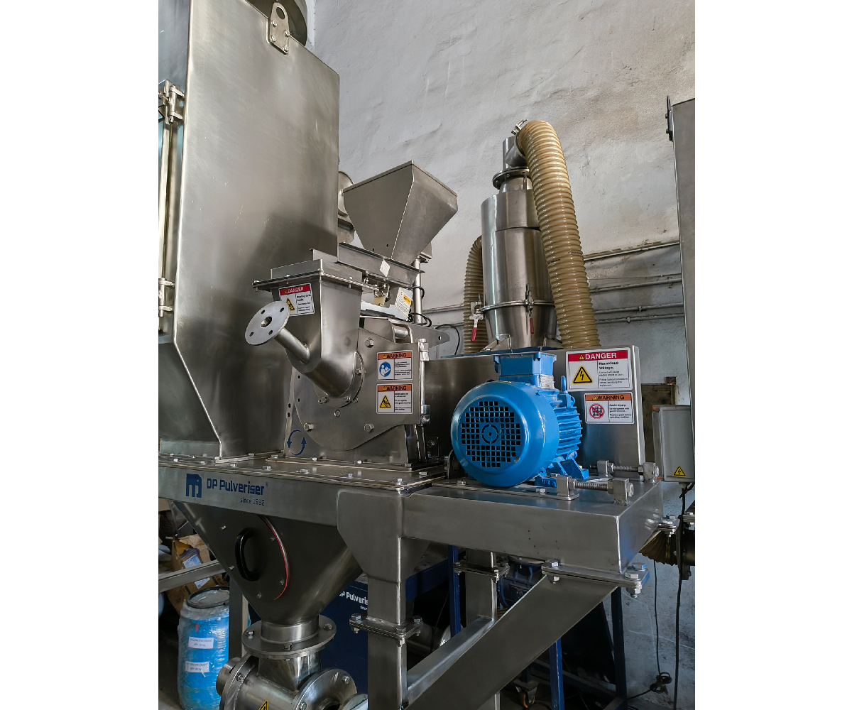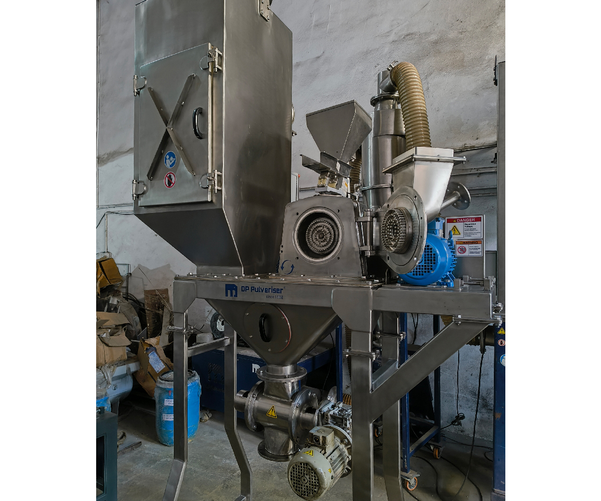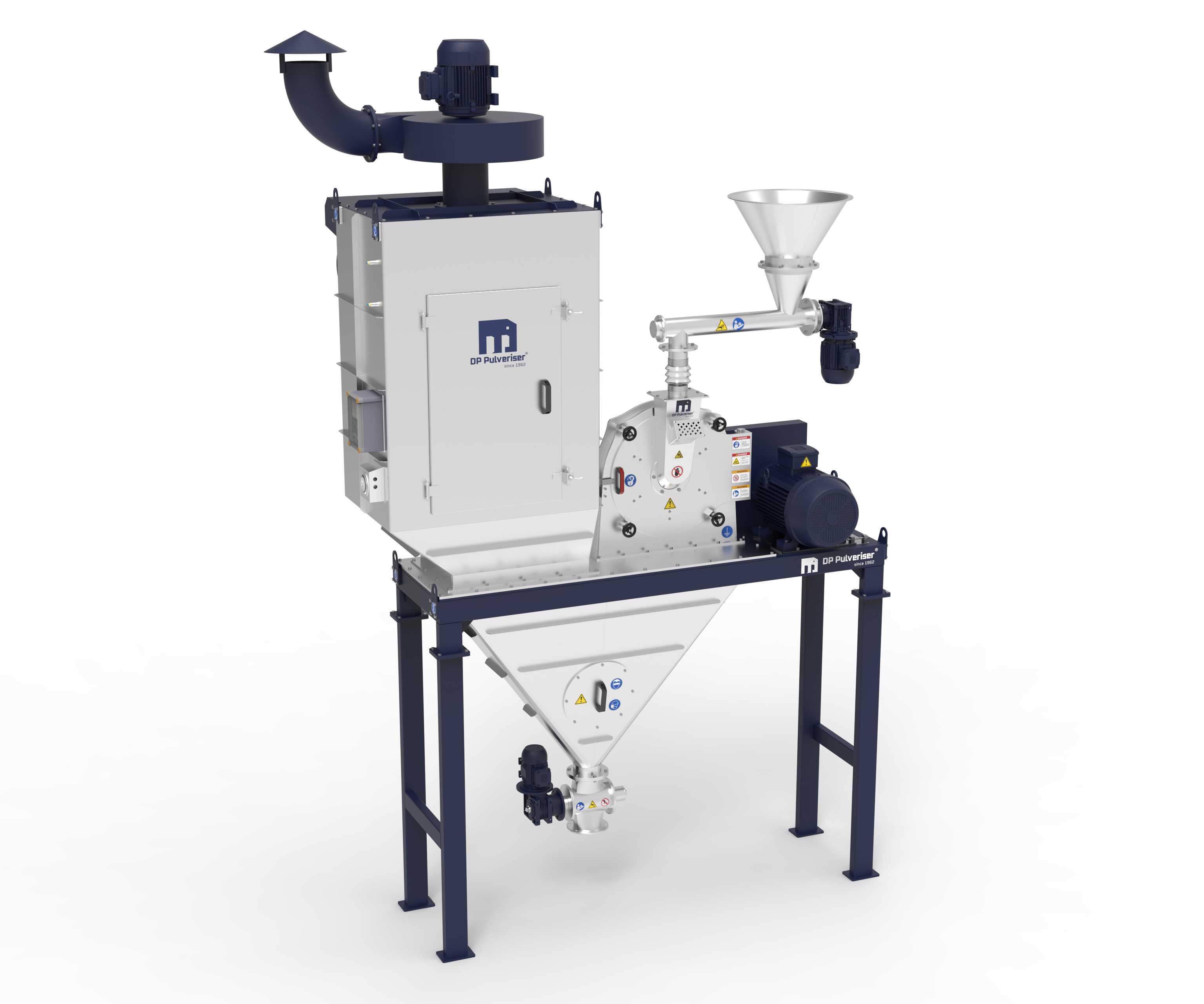This configuration is ideal for crystalline, brittle, and low-oil content materials, producing consistent, uniform fineness. The final product, along with process air, exits via the fine product & air outlet (7) for collection or pneumatic conveying. Particle size can be adjusted by varying rotor speed, pin configuration, and feed rate to meet specific application requirements.