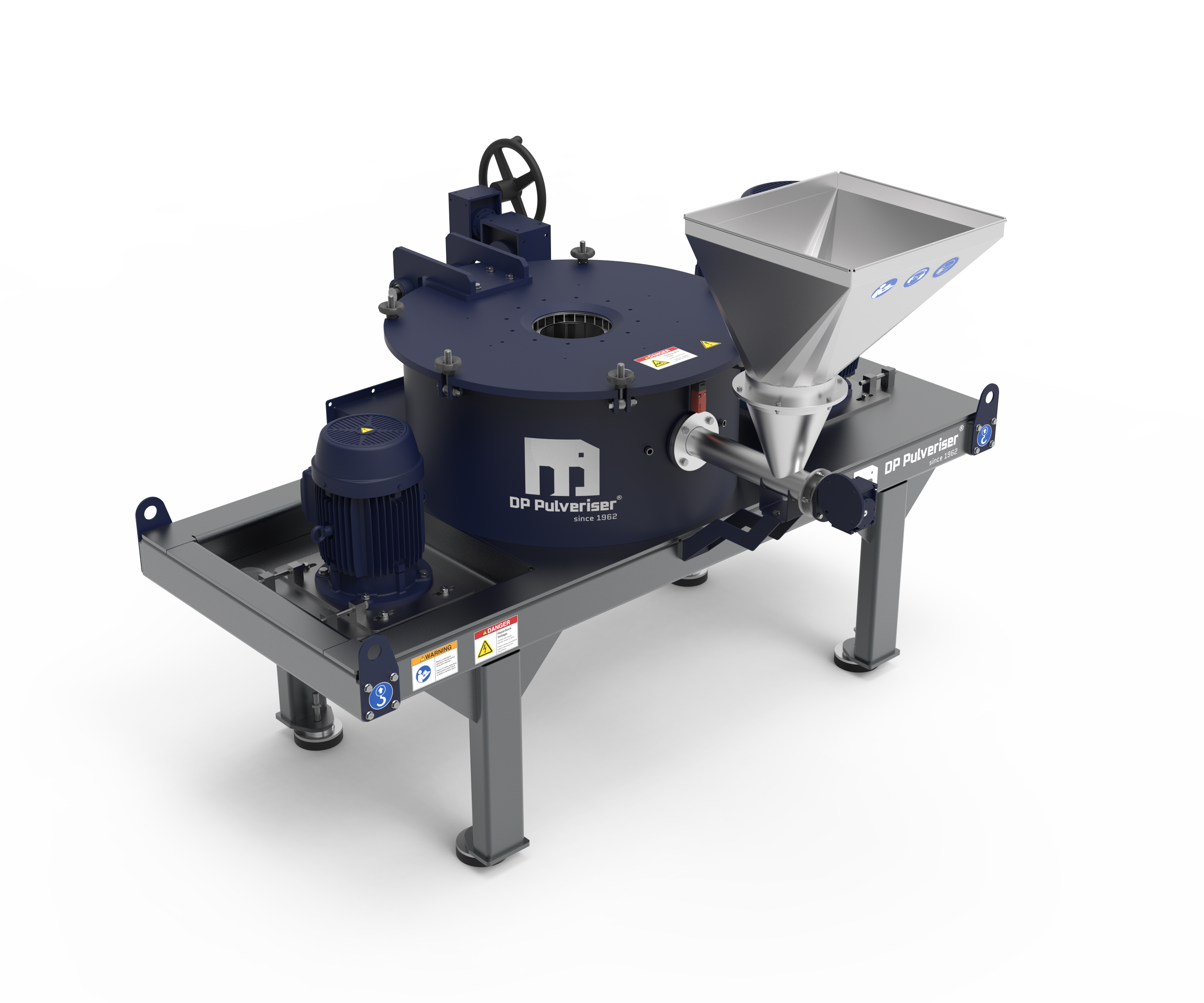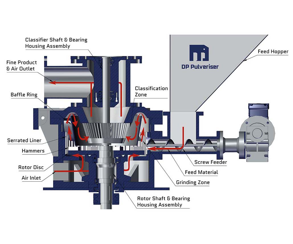 The DP® Air Classifier Mill integrates continuous grinding and dynamic classification into a single compact unit. The feed material enters through the feed hopper (1), where a screw feeder (2) delivers it at a regulated rate into the grinding zone (3). Inside this zone, a high-speed rotor disc (4) fitted with hammers (5) accelerates the material outward. The serrated liner (6), positioned along the chamber wall, enhances impact by deflecting the material back into the hammer path, resulting in efficient size reduction through repeated collisions.