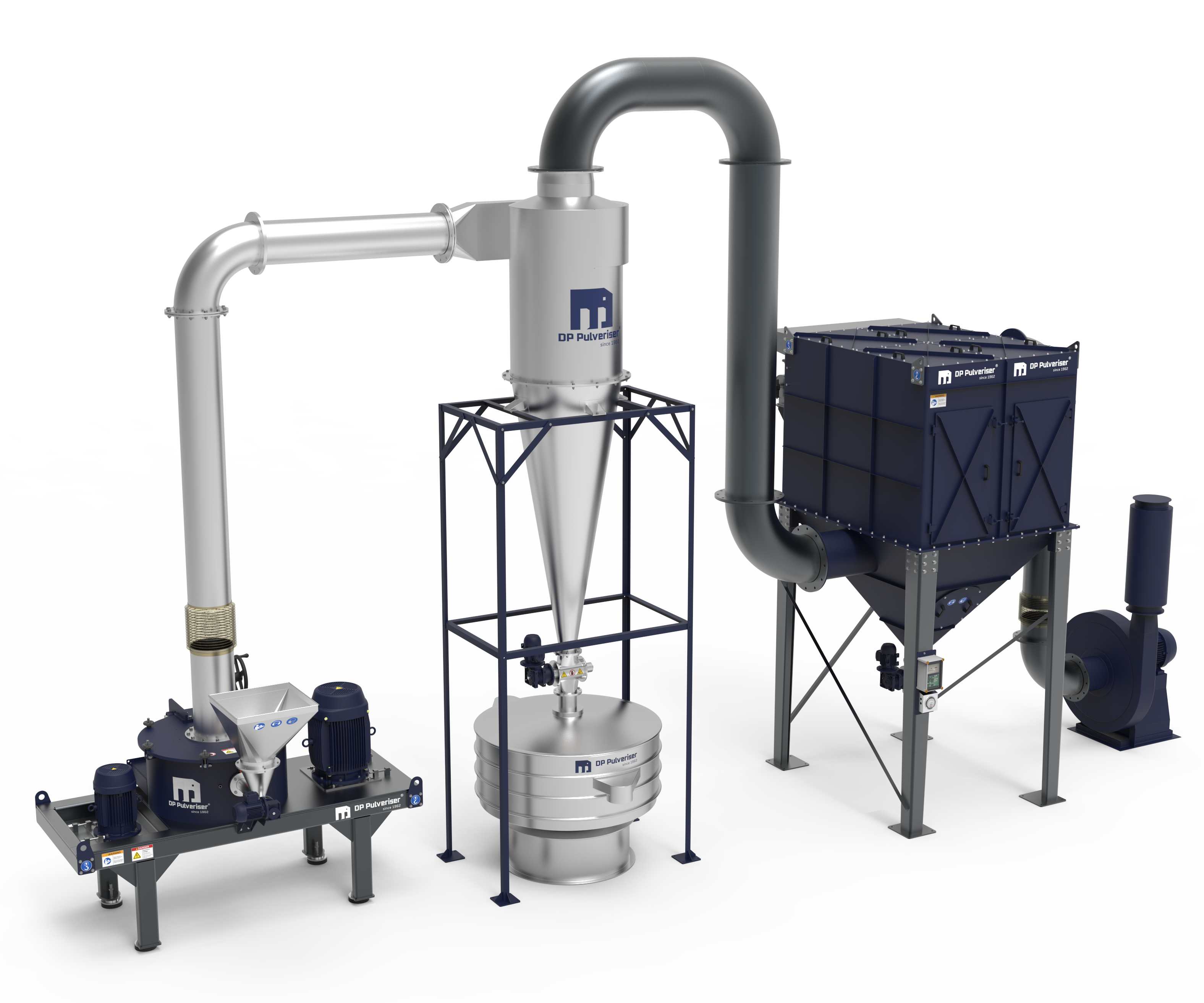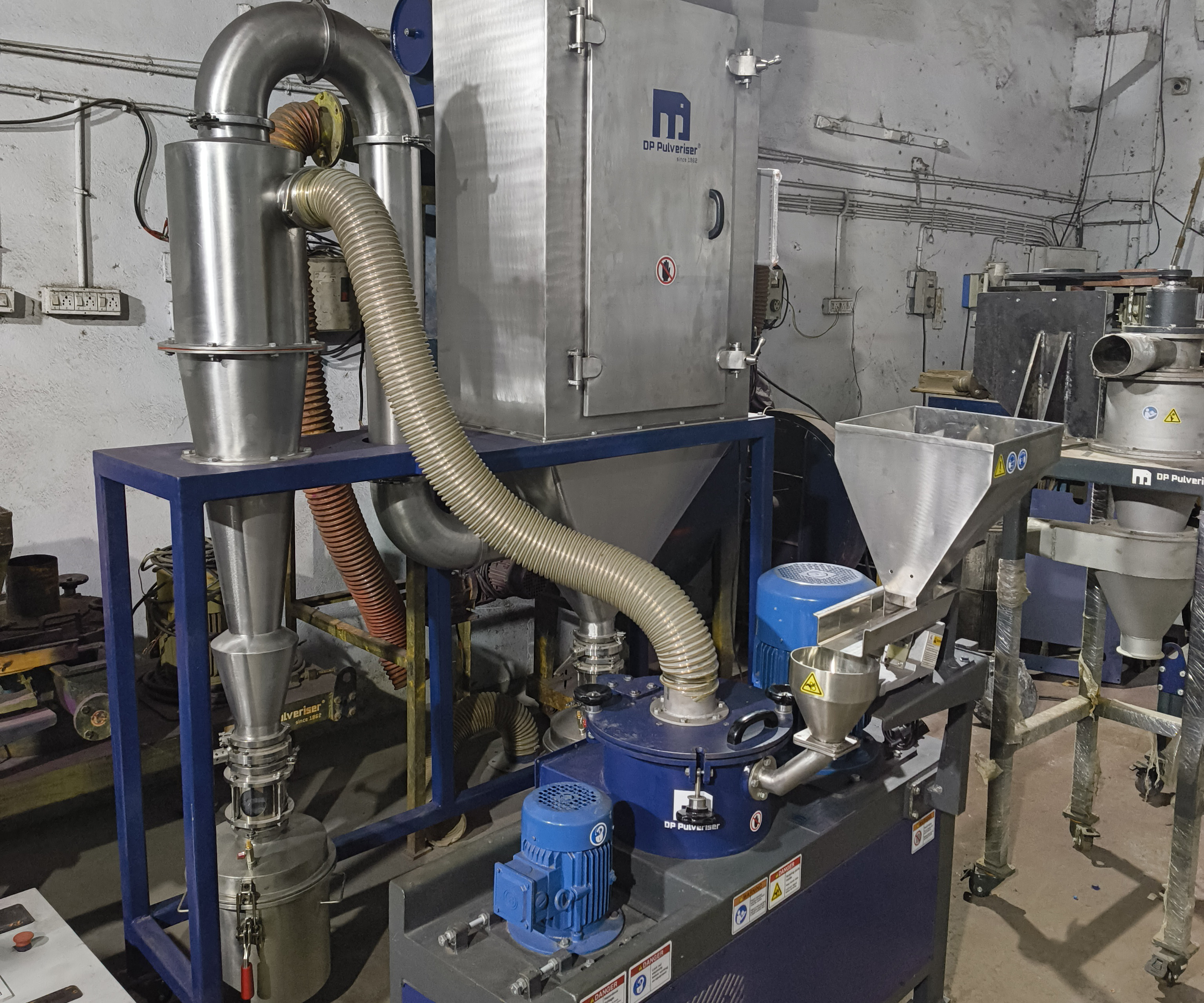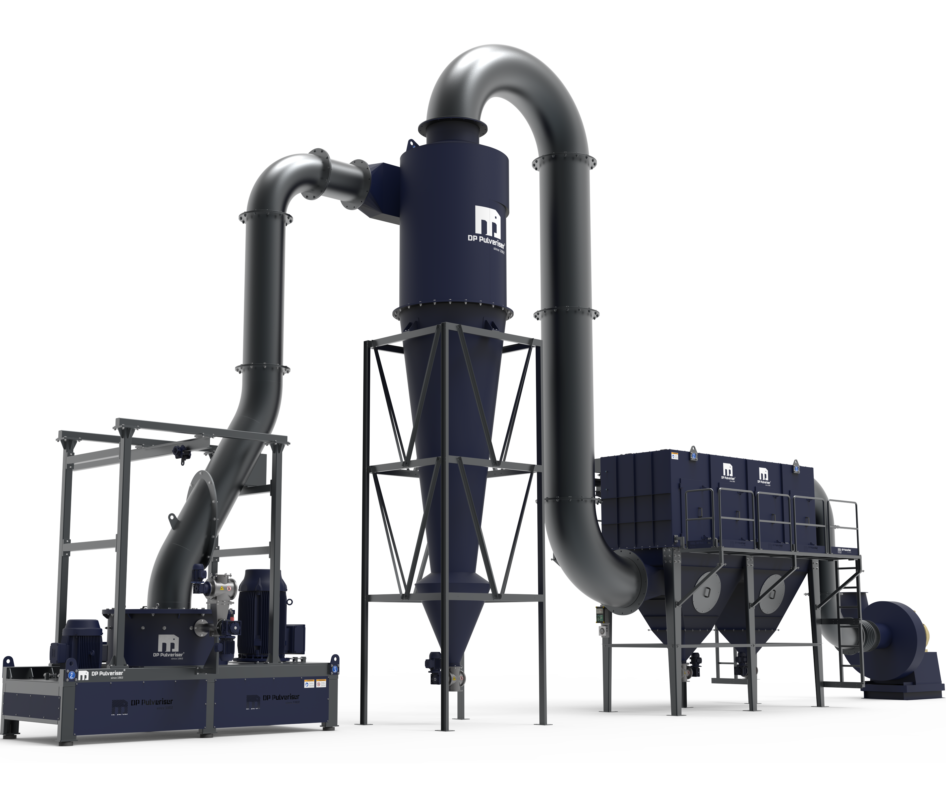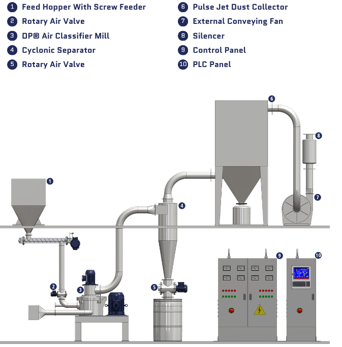 The mixture of fine product and air is then conveyed through external piping to a cyclonic separator, where the product is separated and collected. Any remaining ultrafine dust is carried further to a pulse-jet dust collector, ensuring clean and dust-free air discharge. The system also include a conveying blower to maintain controlled airflow. Overall, the integrated design allows for precise particle size control, energy-efficient grinding, and dust-free operation in a compact and maintainable layout.