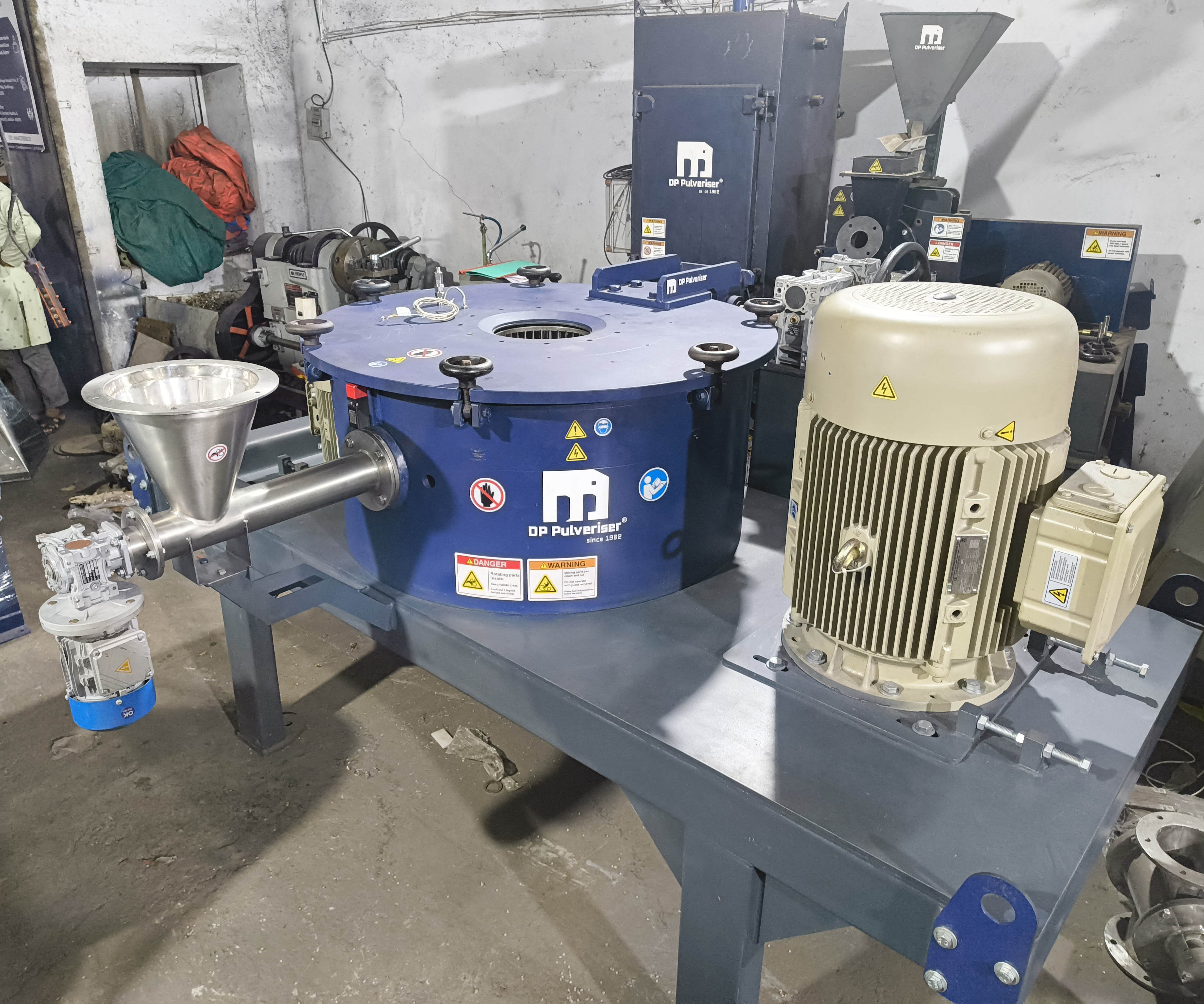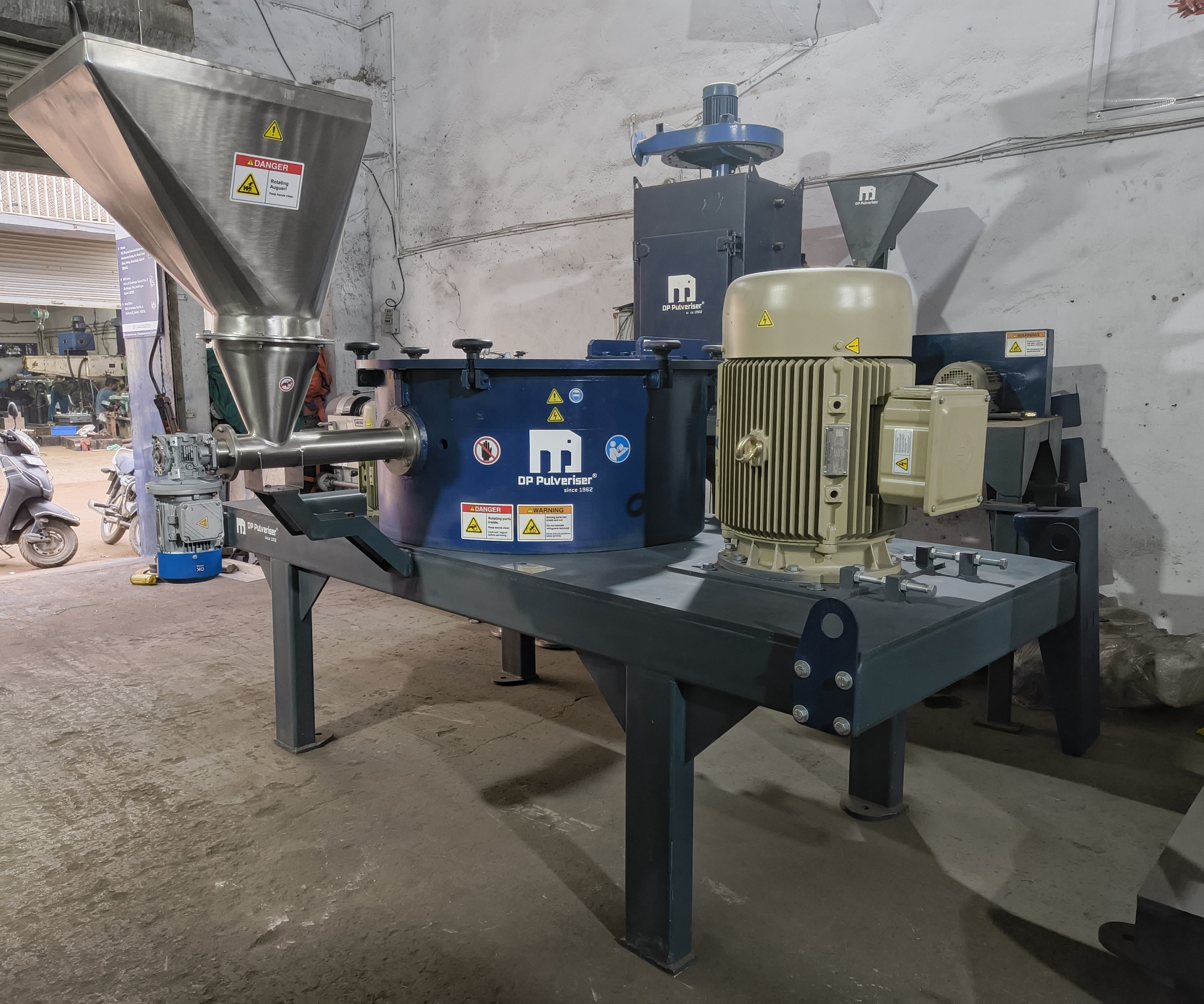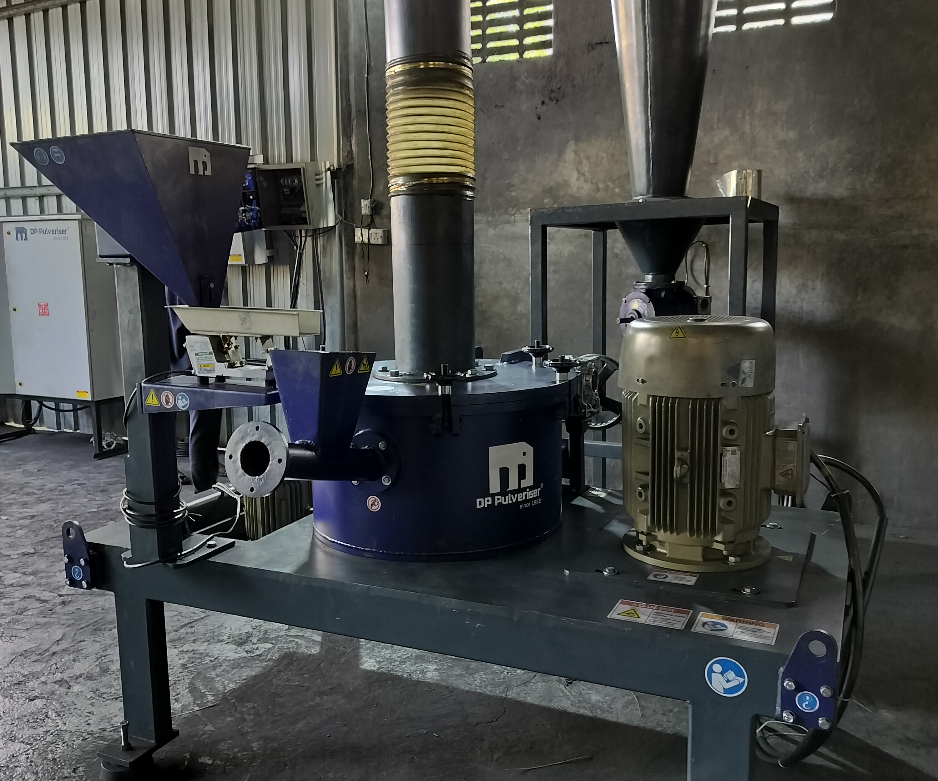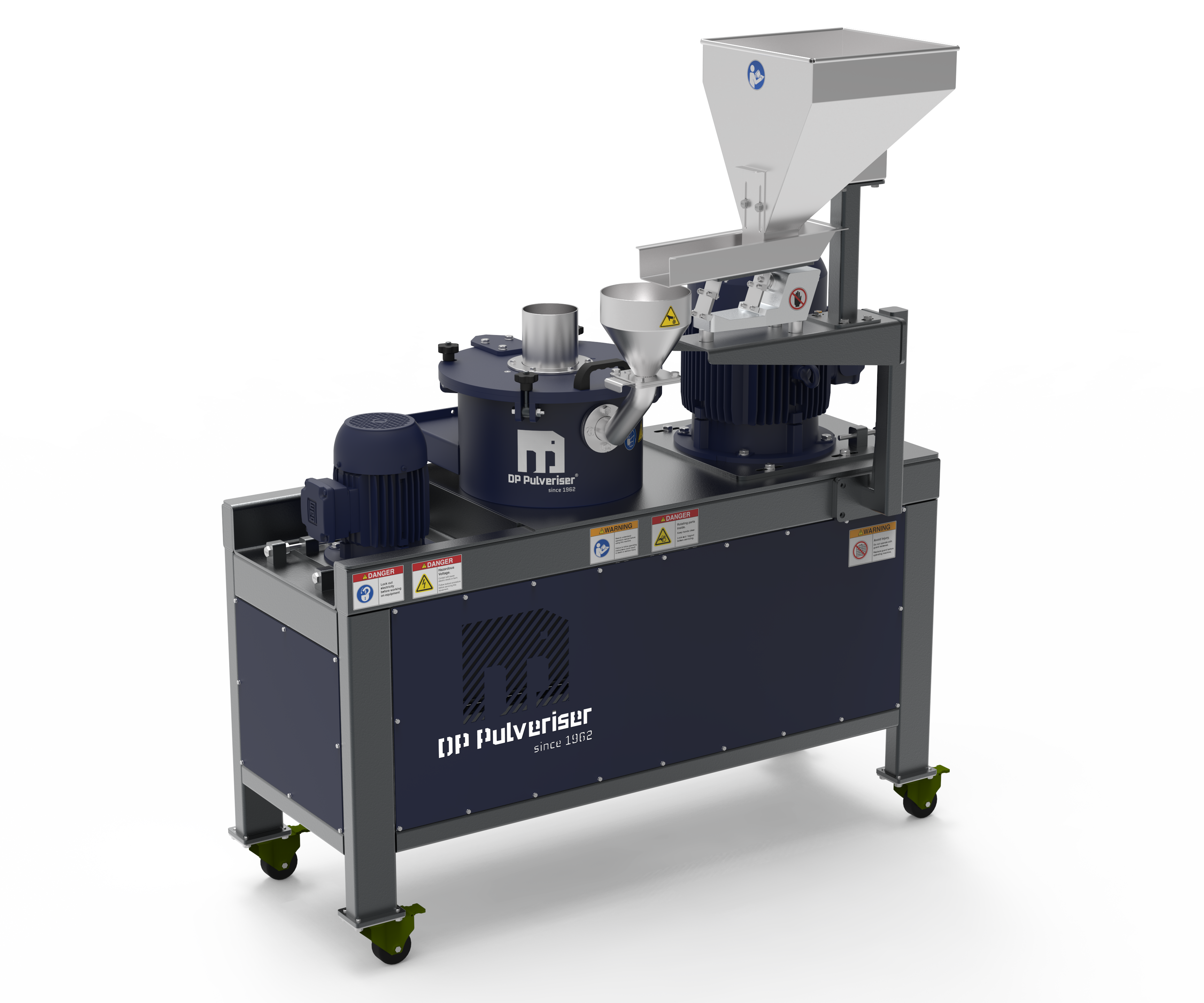 The mixture of fine product and air is then conveyed through external piping to a cyclonic separator, where the product is separated and collected. Any remaining ultrafine dust is carried further to a pulse-jet dust collector, ensuring clean and dust-free air discharge. The system also include a conveying blower to maintain controlled airflow. Overall, the integrated design allows for precise particle size control, energy-efficient grinding, and dust-free operation in a compact and maintainable layout.